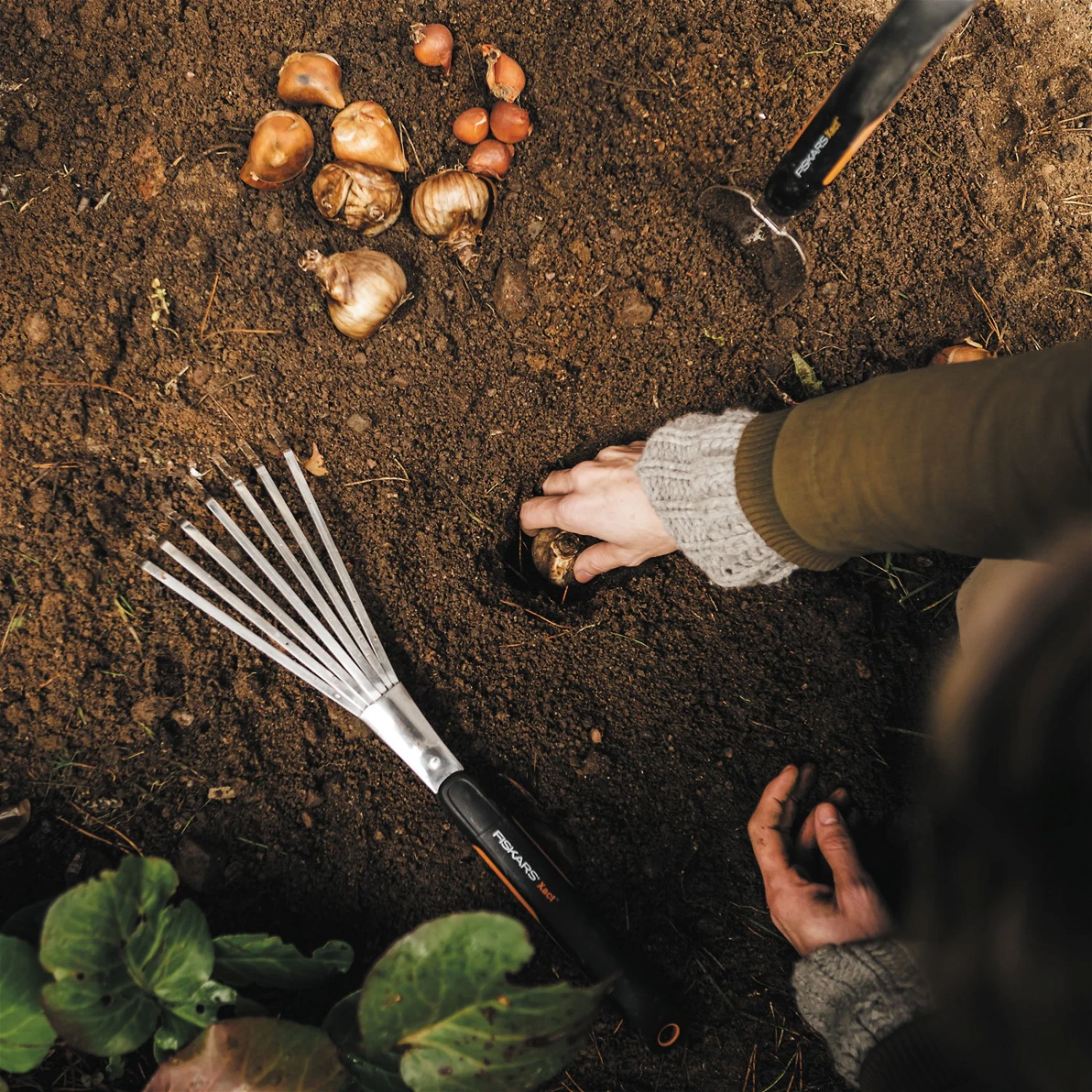 Der fächerförmige Handrechen zum Aufrechen von Laub, Unkraut und Grasschnitt eignet sich hervorragend für kleine Blumenbeete und schwer zugängliche Stellen. Während der perfekt veredelte Edelstahlkopf für höchste Präzision und Kontrolle sorgt, gewährleistet der verlängerte Griff eine bessere Balance und eine bessere Hebelwirkung. Zusätzlich sorgt das besondere Griffdesign für ein angenehmes Arbeiten in unterschiedlichen Arbeitspositionen.