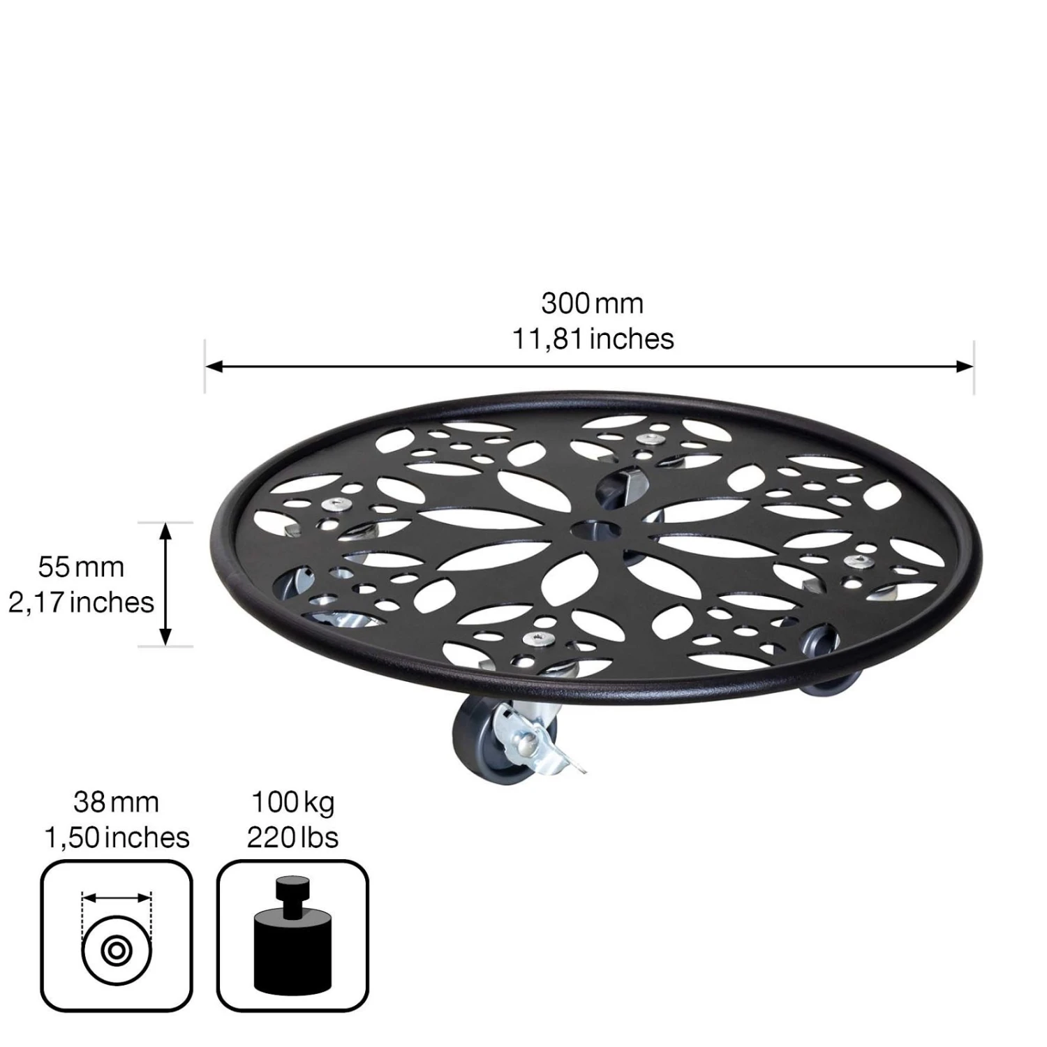 Dieser Pflanzenroller mit einer Tragfläche aus massivem Stahlblech besticht durch seinen anspruchsvollen Designentwurf und hält Belastungen von bis zu 100 Kilogramm problemlos stand. Ein umlaufender Stahlrand verleiht dem Modell nicht nur ein Plus an Stabilität, sondern verhindert auch, dass die Pflanzgefäße unterwegs abrutschen.
