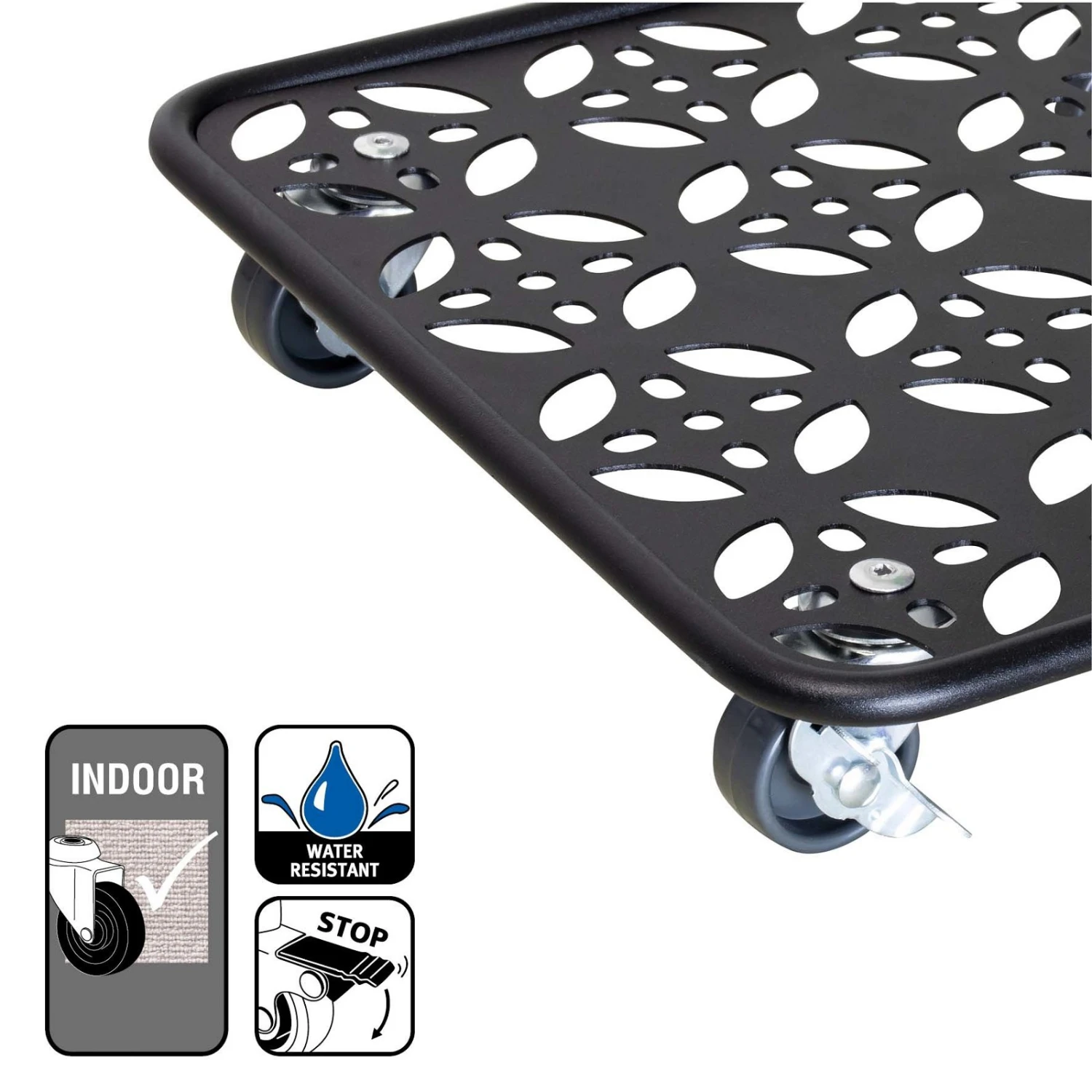Bis zu 80 Kilogramm schwere Pflanzkübel lassen sich mit diesem dekorativ gestalteten Roller mühelos transportieren. Der quadratische Pflanzenroller GH0936/0937 besteht aus strapazierfähigem Stahl und ist leicht in Ihre Wunschrichtung zu manövrieren. Ein Rand aus robustem Stahldraht verhindert das Abrutschen der Pflanzgefäße beim Transport.