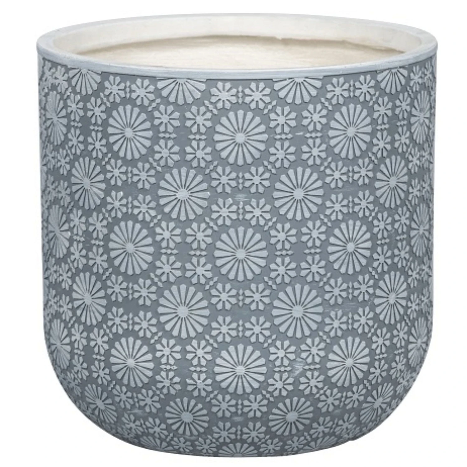 Das hellgraue Pflanzgefäß ‚Chester‘ von Kölle ist aus einem witterungsbeständigen und pflegeleichten Verbundstoff mit Glasfaser handgefertigt. Eine Besonderheit von diesem dekorativen Pflanztopf ist seine mit filigranem organisch-geometrischem Motiv verzierte Oberfläche. Sie können das Pflanzgefäß ‚Chester‘ je nach Wunsch zum Begrünen von den Innenräumen oder von dem Außenbereich einsetzen.