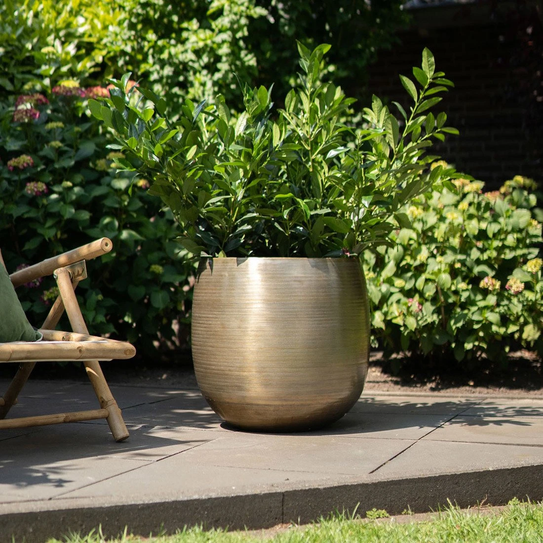 Gestalten Sie Ihre Begrünung im Innen- oder Außenbereich mit diesem imposanten Pflanztopf auf eine einzigartige und luxuriöse Art. Das Aluminium-Pflanzgefäß ‚Rowen‘ von Kölle begeistert als ein Schmuckstück in Designer-Qualität und besticht durch die edle Goldoptik. Eine Besonderheit des Blumentopfs stellt seine individuell per Hand aufgetragene Oberflächenstruktur dar, wodurch sich jedes Exemplar in ein Unikat verwandelt. Das Leichtmetall Aluminium überzeugt nicht nur mit einem geringen Eigengewicht, sondern ist auch wetterfest und rostfrei. Somit spricht nichts dagegen, das Pflanzgefäß ‚Rowen‘ rund ums ganze Jahr auf der Terrasse oder dem Balkon zu verwenden. Der Pflanztopf fasst solide 57 Liter und lässt sich mit einer Goldfruchtpalme oder Bambus, mit Ziergräsern oder zum Beispiel mit einer Azalee dekorativ bestücken.