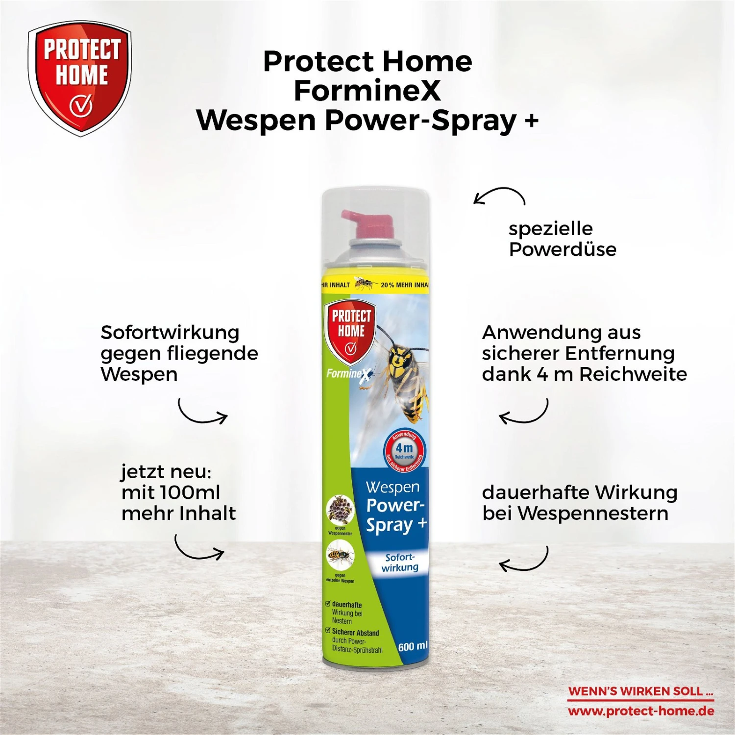 Das Wespen-Powerspray von ‚Protect Home‘ eignet sich zur Abwehr von lästigen Insekten, allen voran der Deutschen und Gemeinen Wespenarten. Mit dem Wespen-Powerspray bekämpfen Sie nicht nur einzelne Wespen, sondern auch Wespennester. Denken Sie daran, dass die Wespen zu den geschützten Arten gehören und die Nester ohne triftigen Grund nicht vernichtet werden dürfen.