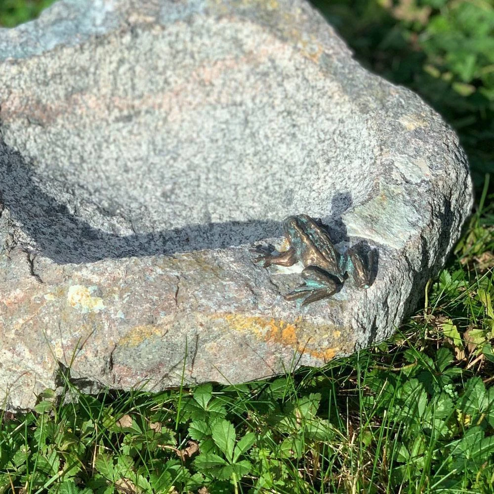 Die Mini-Vogeltränke mit Frosch/Eidechse von Rottenecker ist aus hochwertigem Naturstein Granit gefertigt und mit einer dekorativen Bronzefigur verziert. Im Sommer leiden die Vögel oft Durst und sind für das von Ihnen bereitgestellte kühle Nass dankbar. Retten Sie Vogelleben und versorgen Sie Amseln und Elster, Eichelhäher und Sperlinge mit dem lebensspendenden Element.
