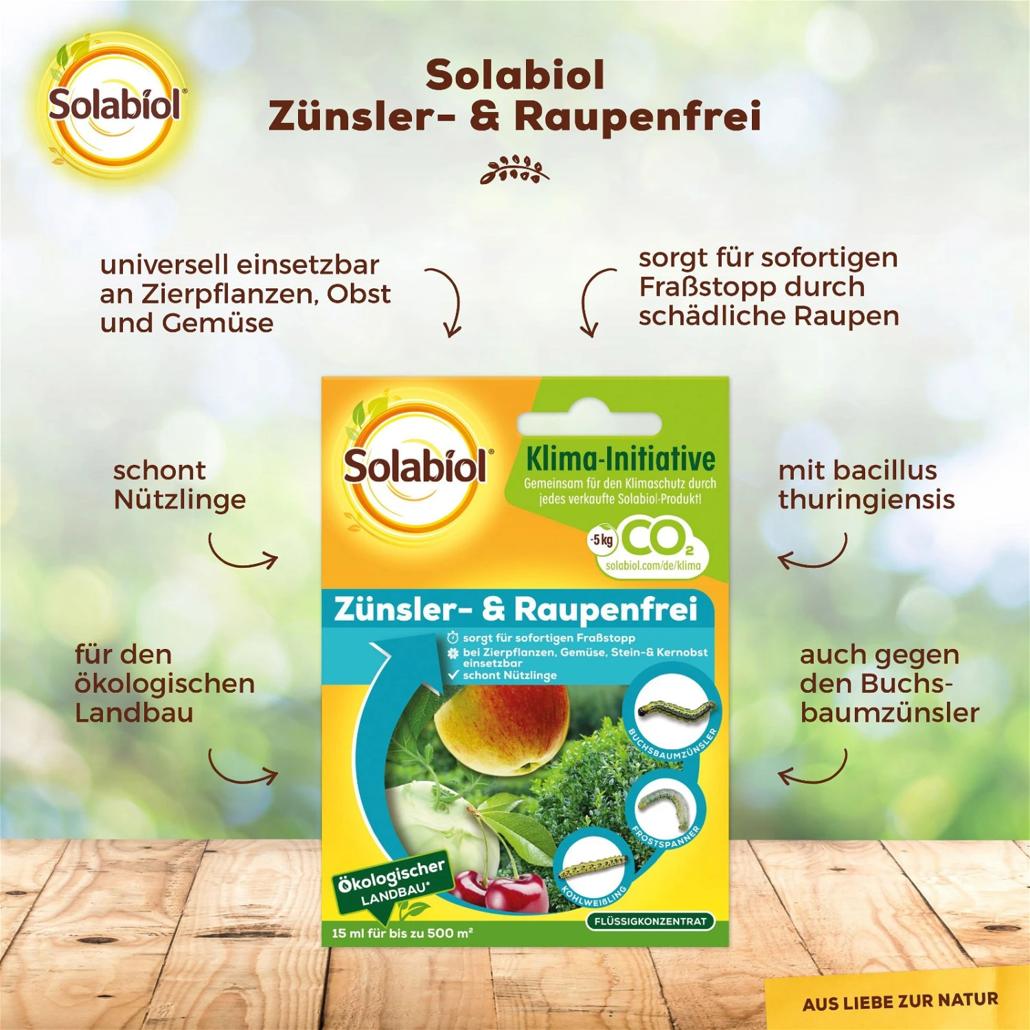 Das Zünsler- und Raupenfrei von ‚Solabiol‘ unterstützt Sie im Kampf gegen die Raupen des Buchsbaumzünslers sowie anderer gefürchteten Schädlinge. Dieses flüssige Mittel stoppt sofort den Fraß und ist einfach zu dosieren. Ein weiterer Vorteil von Zünsler- und Raupenfrei ist es, dass die Nützlinge bei der Anwendung keinen Schaden nehmen.